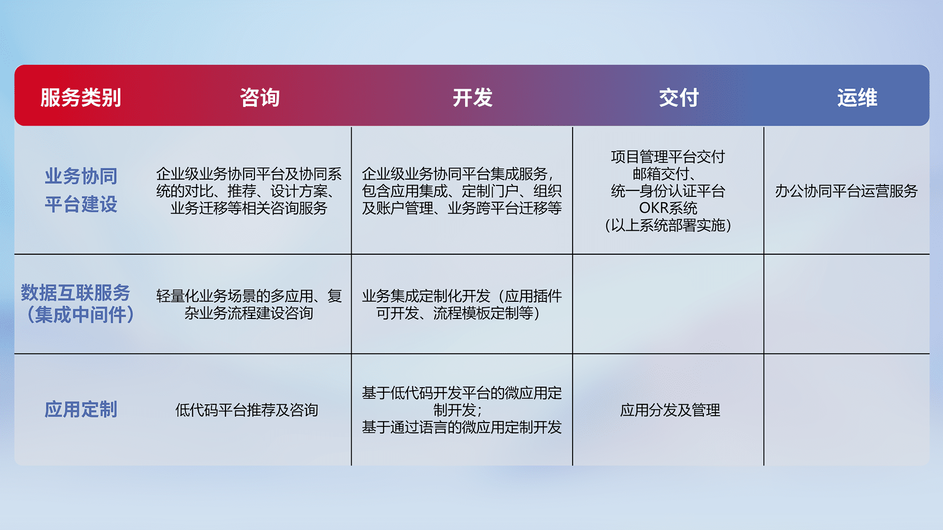 针对钉钉、、、、企微、、、IDaas等平台级产品提供产品的规划、、、方案、、、、交付、、、定制化开发等服务,,,,实现如统一协同办公、、、智能客户服务、、混合会议管理、、、智能数据查询、、、等业务场景,,,实现数字化转型。。